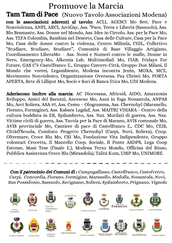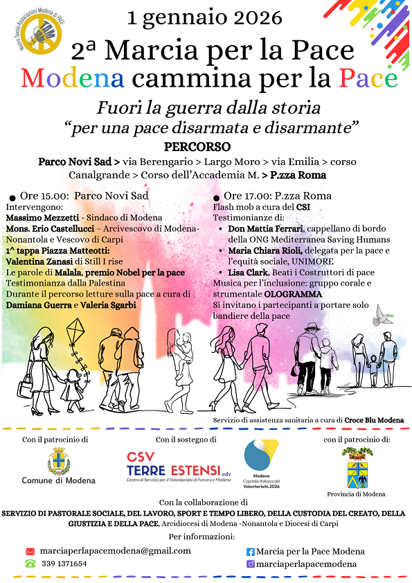 La Camminata per la Pace gode del patrocinio di Comune e Provincia di Modena, con il sostegno di Centro Servizi Volontariato Terre Estensi e di Modena Capitale italiana del Volontariato 2026, e con la collaborazione dell’Arcidiocesi di Modena-Nonantola e Diocesi di Carpi.