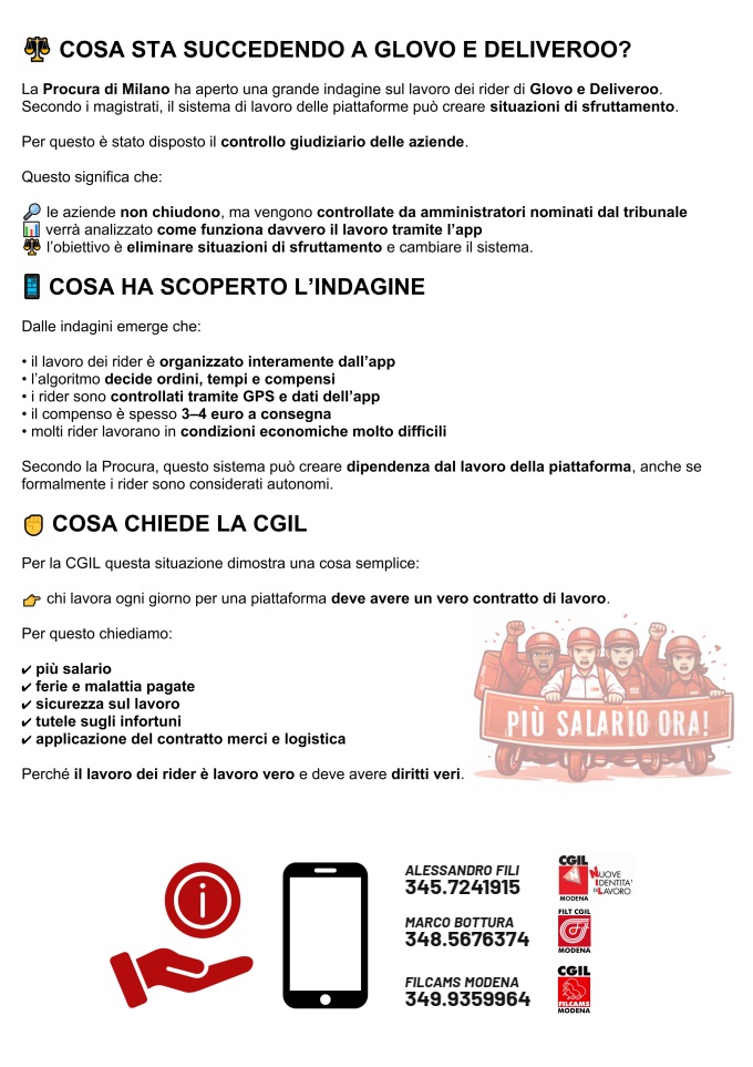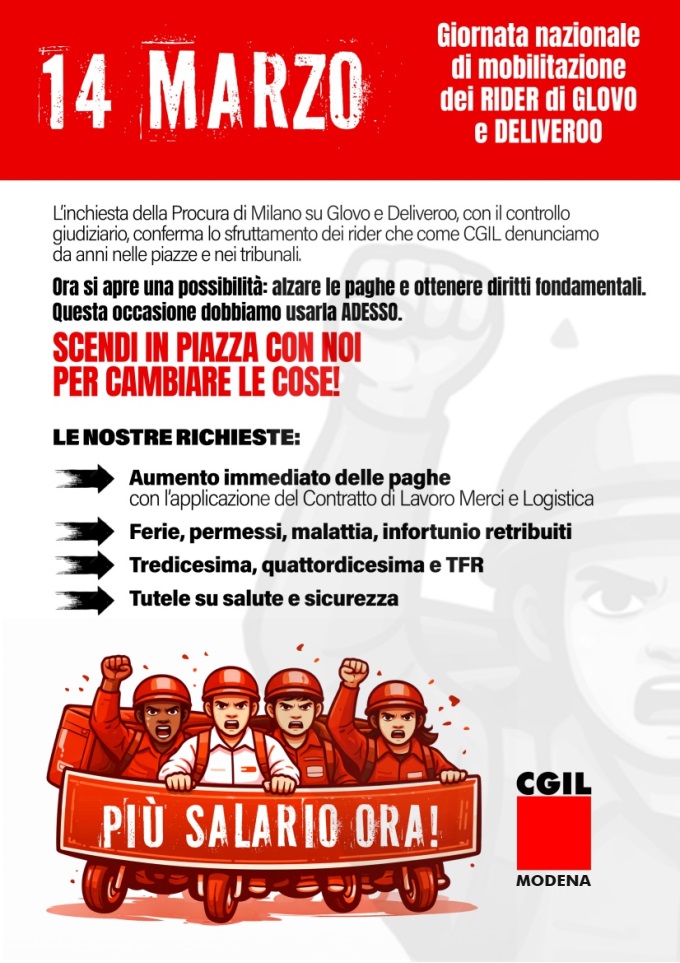 I sindacati modenesi Filcams (terziario e servizi), Filt (trasporto merci e logistica) e Nidil (lavoratori autonomi) Cgil saranno per le vie del centro storico nella giornata di sabato 14 marzo per informare i rider di Glovo e Deliveroo distribuendo volantini per spiegare quali sono le proposte della Cgil, a partire dall’aumento del salario, l’applicazione del Contratto di lavoro merci e logistica e dal riconoscimento dei diritti basilari previsti dallo Statuto dei Lavoratori nel 1970. Perché appare incredibile, ma nel 2026 serve ancora ribadire che chi lavora deve avere diritti quali la copertura economica in caso di malattia, infortunio, ferie, permessi e condizioni minime a tutela della saluta e della sicurezza di chi lavora.