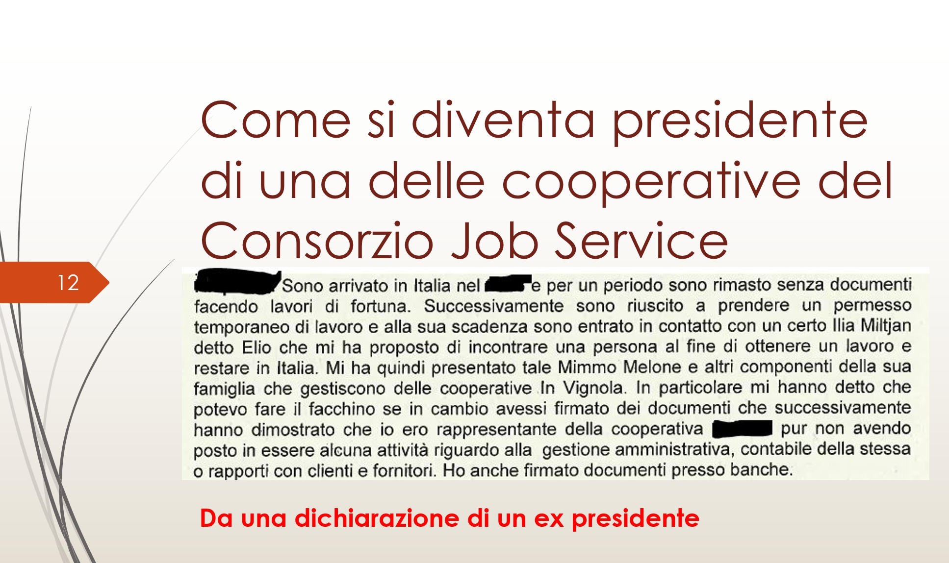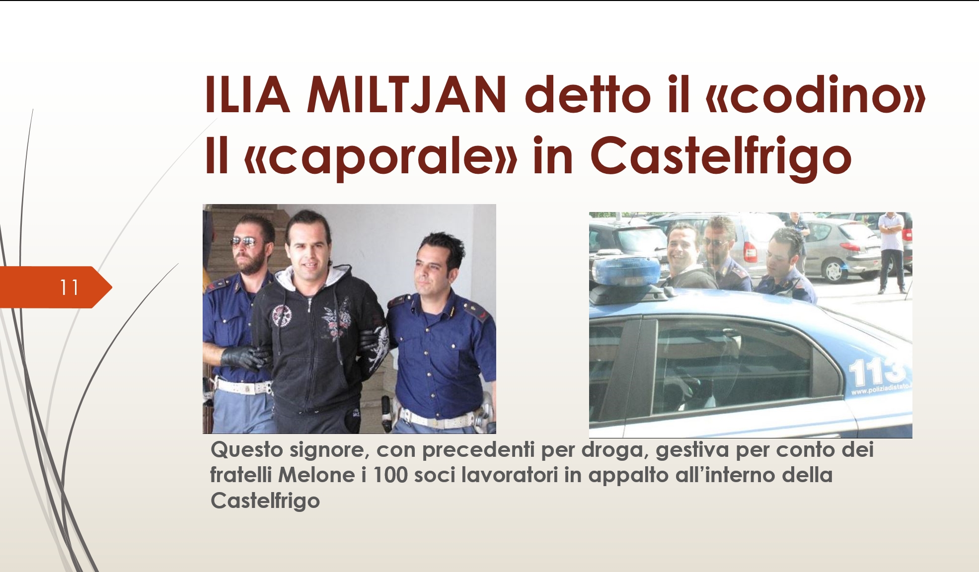 Castelfrigo, dei fratelli Ciriesi, assegnava in appalto parte della lavorazione carni al Consorzio Job Service con Presidente Tramontano Antonio, in realtà messo in piedi dai Melone (fratello e sorella); il Consorzio affidava la lavorazione alle Cooperative Ilia d.a. e Work Service con Presidenti Avdiu Denis e Hyra Rustem, che si avvalevano di Ilia Miltjan (detto il “codino”) per la gestione dei lavoratori che operano in appalto.