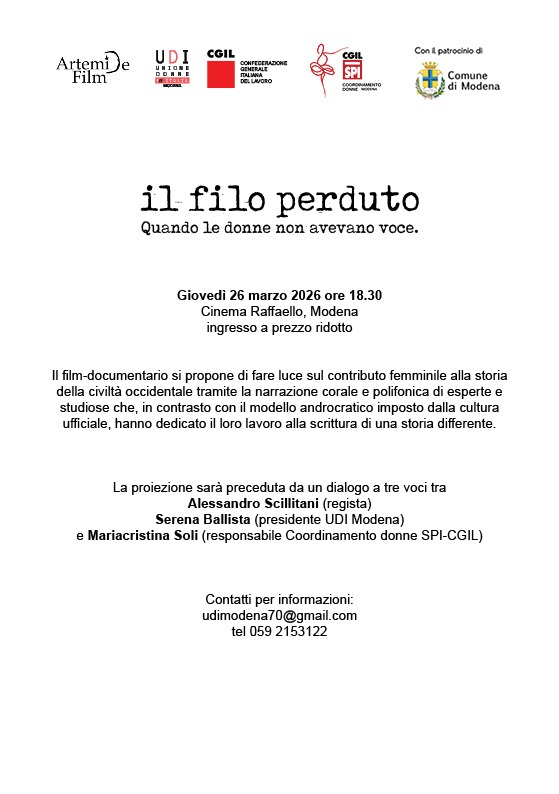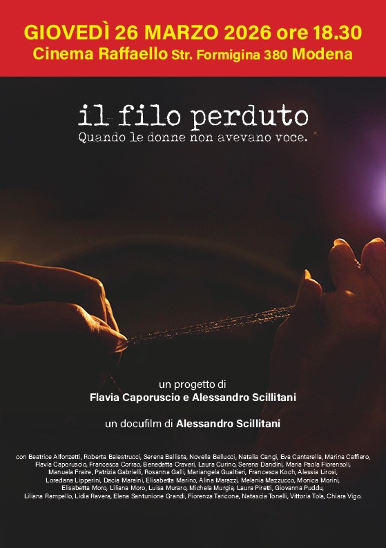 19 Mar 2026 alessandro scillitani, cgil, cinema, cinema raffaello, consapevolezza di genere, coordinamento donne spi, cultura femminile, docufilm, flavia caporuscio, genere, il filo perduto.quando le donne non avevano voce, modena, spi, storia femminile,