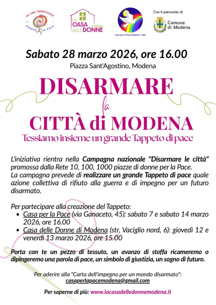 L’iniziativa, ha il patrocinio del Comune di Modena e lancia una più ampia Campagna nazionale dal titolo Disarmare le città promossa dalla Rete 10,100,1000 piazze di donne per la Pace che prevede di realizzare un grande Tappeto di Pace. A Modena la grande installazione tessile collettiva si realizzerà sabato 28 marzo dalle ore 16.00 in piazza Sant’Agostino.