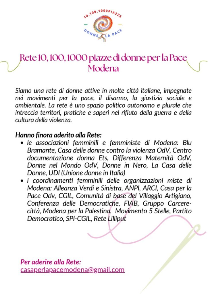 Hanno finora aderito alla Rete 10, 100, 1000 piazze di donne per la pace di Modena: