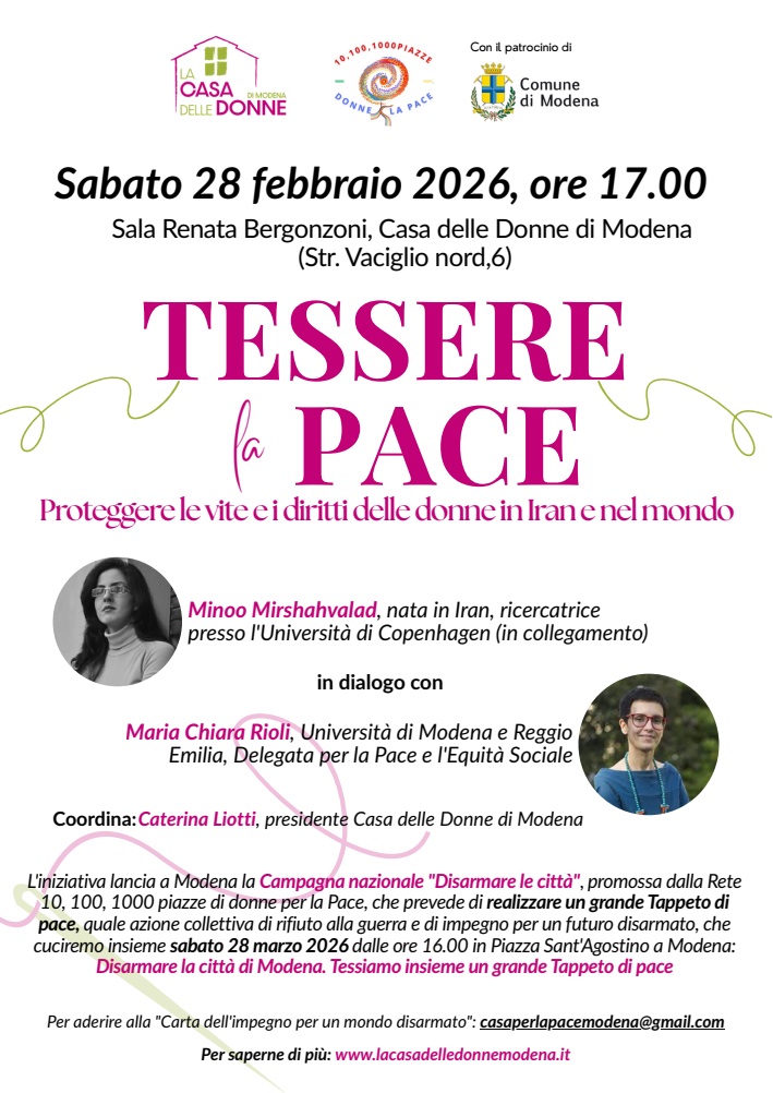 Tessere la Pace. Proteggere le vite e i diritti delle donne in Iran e nel mondo” è l’incontro promosso da La Casa delle Donne di Modena, in collaborazione con la Rete 10, 100, 1000 piazze di Donne per la Pace, sabato 28 febbraio alle 17 presso la Casa delle Donne (sala Renata Bergonzoni, strada Vaciglio nord, 6).