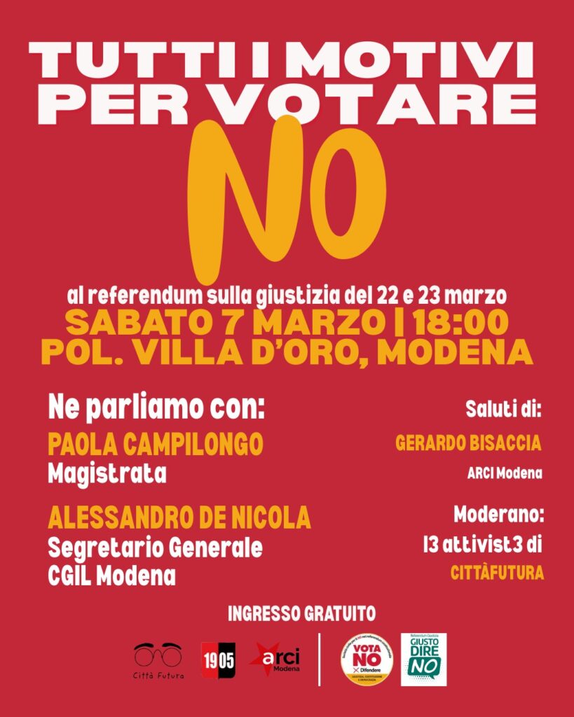 Sabato 7 marzo alle ore 18 presso la Polisportiva Villa D’oro di Modena, incontro “Tutti i motivi per votare NO” con Paola Campolongo magistrata e Alessandro De Nicola segretario Cgil Modena. Saluti di Gerardo Bisaccia di Arci Modena, moderano 13 attivist3 di Cittàfutura.