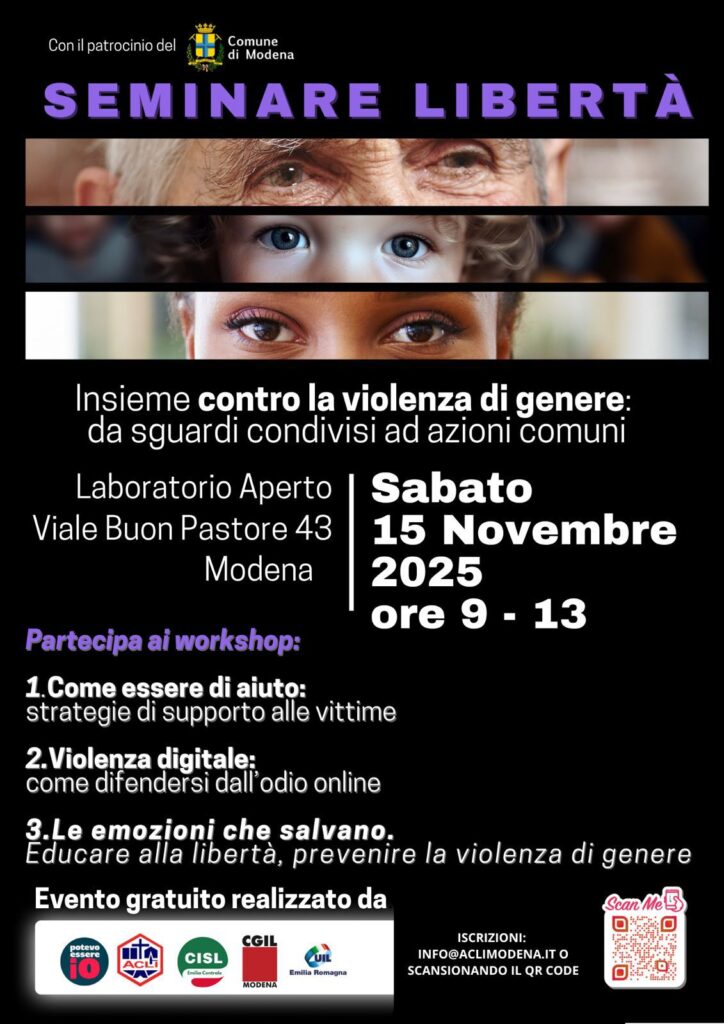 “Seminare libertà” è un laboratorio contro la violenza di genere promosso da Acli Provinciali di Modena APS, dai sindacati confederali Cgil Cisl Uil ed è patrocinato dal Comune di Modena. L’iniziativa è coordinata da esperti e formatori della community “Potevo essere io”, nata per raccontare, formare e reagire.