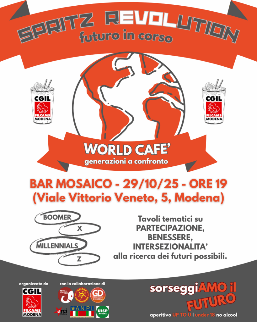 Torna anche quest’anno “Spritz Revolution“, l’aperitivo del cambiamento. L’appuntamento, ormai alla sua terza edizione, è promosso dal sindacato terziario-commercio Filcams Cgil Modena per un confronto pubblico in cui Boomer, Gen X, Millenial, Gen Z dialogheranno su temi come il lavoro di oggi e di domani, le sfide generazionali, i diritti, le tutele e le nuove forme di partecipazione.